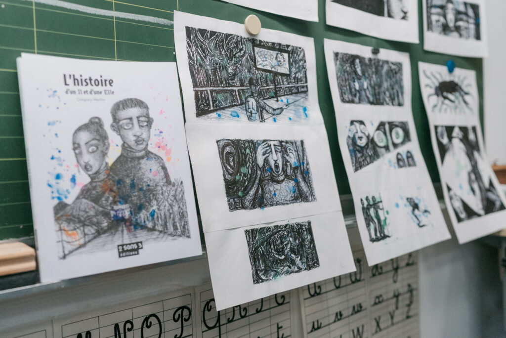 Les projets sont préparés avec les enseignants. Les classes lisent les œuvres des invités et réalisent leurs propres productions (textes, dessins, livres-objets…) présentées lors du salon du livre en clôture du festival.